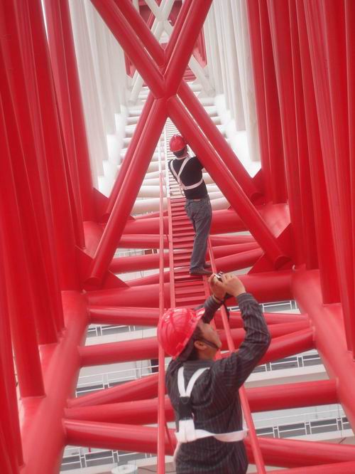 大連中遠(yuǎn)公司兩位工程師爬上起重機(jī)臂架上,對(duì)臂架焊接的桁架結(jié)構(gòu)進(jìn)行檢查